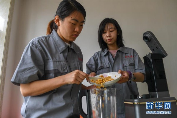 Lu Xiaoquan (R) and Wang Chaoping mix brown rice and soybeans, creating a food product rich in nutrients, on May 30. [Photo by Zhang Nan/Xinhua]