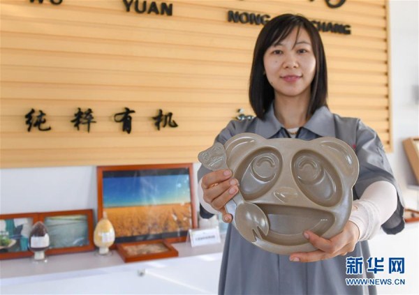 Lu Xiaoquan holds a plate made of rice husks on May 30. [Photo by Zhang Nan/Xinhua]