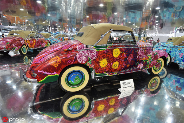 Vintage vehicles covered with colorful oil painting images at the show in Shenzhen, South China's Guangdong province, on June 1, 2019. [Photo/IC]
