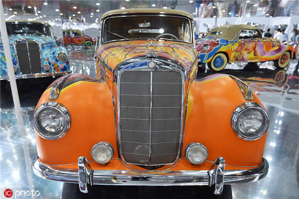 Vintage vehicles covered with colorful oil painting images at the show in Shenzhen, South China's Guangdong province, on June 1, 2019. [Photo/IC]