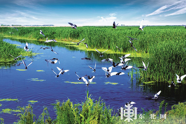 A flock of birds takes wing in the Longfeng Wetland in Daqing, in Northeast China’s Heilongjiang province. [Photo/dbw.cn]