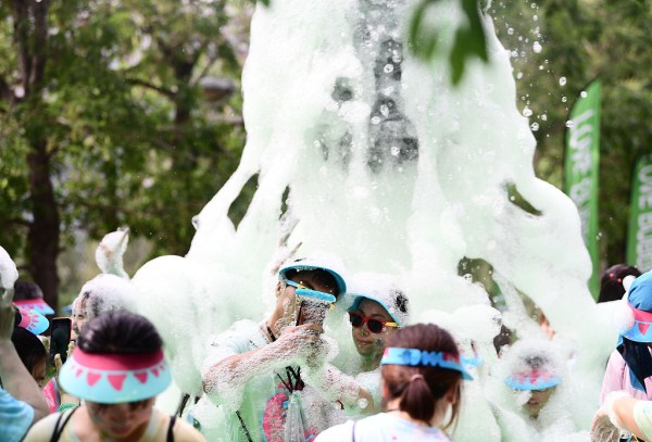 People play with bubbles during the 2019 Love Bubble Run in Shenyang, on June 1. [Photo/VCG]
