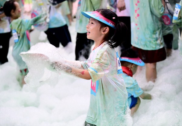 A girl plays with bubbles during the 2019 Love Bubble Run in Shenyang, on June 1. [Photo/VCG]