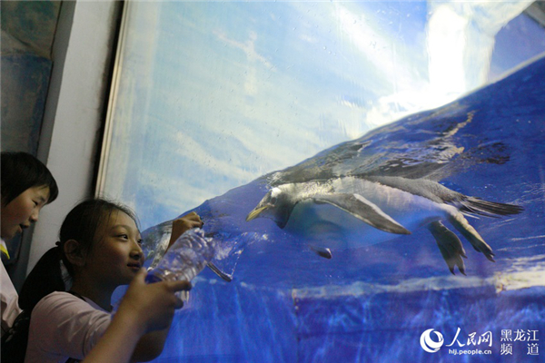 Students interact with a penguin at Harbin Polarland in Harbin, Northeast China’s Heilongjiang province, on May 28. [Photo/people.cn]