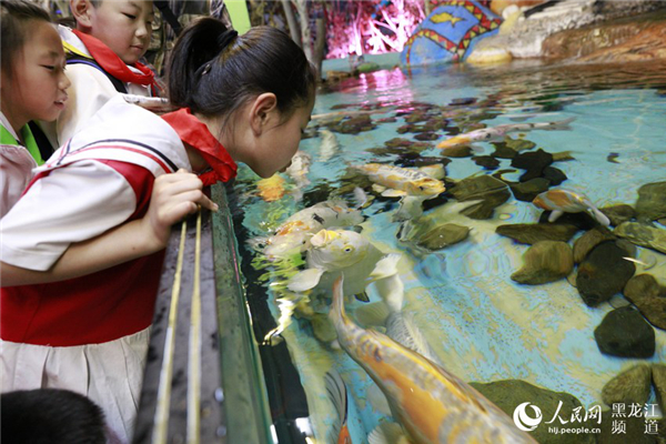 Students admire some goldfish at Harbin Polarland in Harbin, Northeast China’s Heilongjiang province, on May 28. [Photo/people.cn]