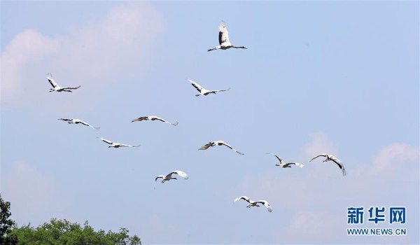 Red-crowned cranes fly at the Shenyang Forest Zoological Garden on June 4. [Photo by Yang Qing/Xinhua]