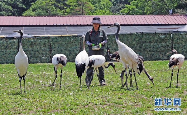 Red-crowned cranes take food under the guidance of a keeper at the Shenyang Forest Zoological Garden on June 4. [Photo by Yang Qing/Xinhua]