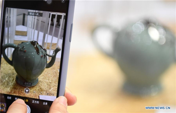A visitor takes photos of Longquan celadon ceramics displayed at an intangible cultural heritage fair on cultural and natural heritage day in Guangzhou, capital of south China's Guangdong Province, June 8, 2019. More than 3,200 activities have been scheduled across China to celebrate this year's cultural and natural heritage day, which falls on June 8. An intangible cultural heritage fair, which showcases 40 items on the List of United Nations Educational, Scientific and Cultural Organization (UNESCO) World Intangible Cultural Heritage, started in Guangzhou from June 7. It applies exhibitions, shows, lectures and forums to present the vivid practice of intangible cultural heritage protection and development in China. [Photo by Deng Hua/Xinhua]