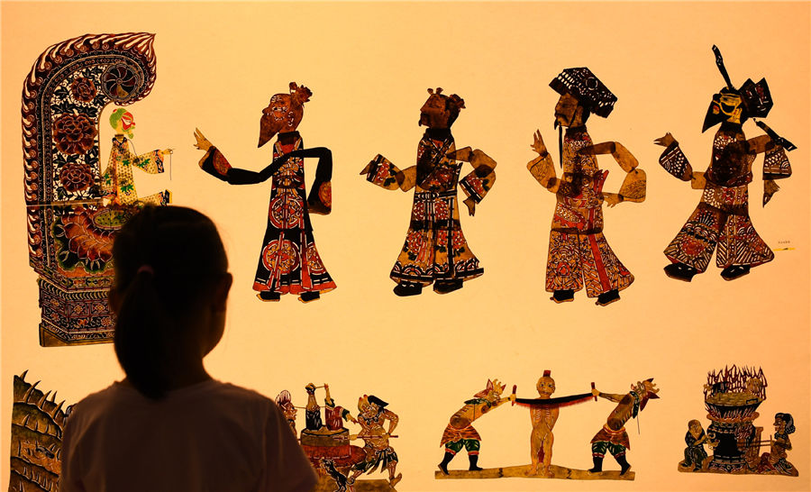 A kid views shadow puppet exhibition at an intangible cultural heritage fair on the Cultural and Natural Heritage Day held in Guangzhou, South China's Guangdong province, on June 8, 2019. [Photo/Xinhua]