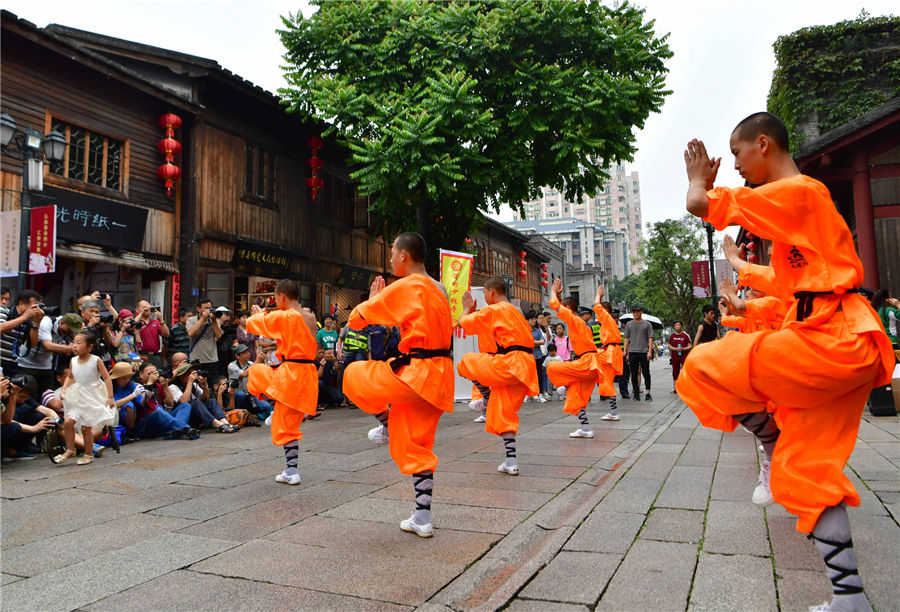 A performance of Shaolin kung fu is seen on the Cultural and Natural Heritage Day at a scenic spot in Fuzhou, East China's Fujian province, on June 8, 2019. [Photo/Xinhua]