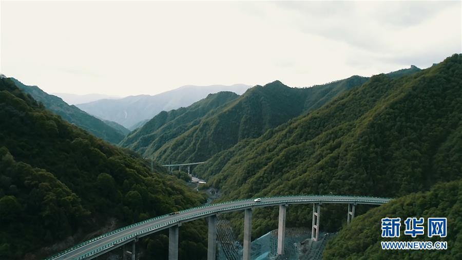 Aerial photo taken on June 11, 2019 shows a car running on the highway linking Zhalonggou with Nianbo township in Northwest China's Qinghai province. [Photo/Xinhua]