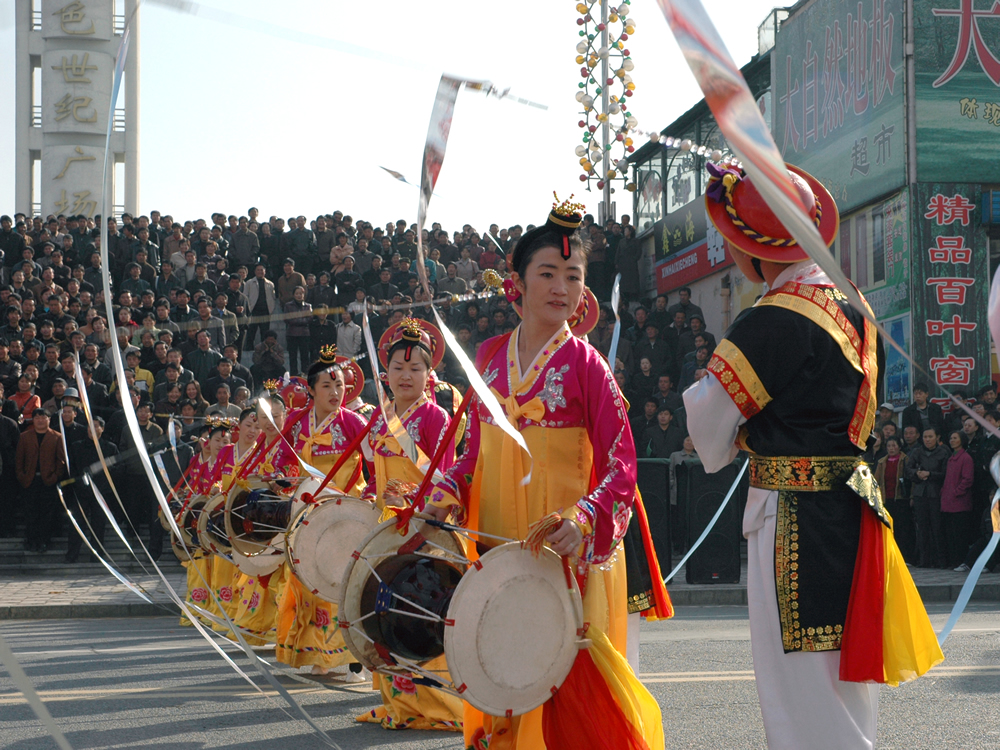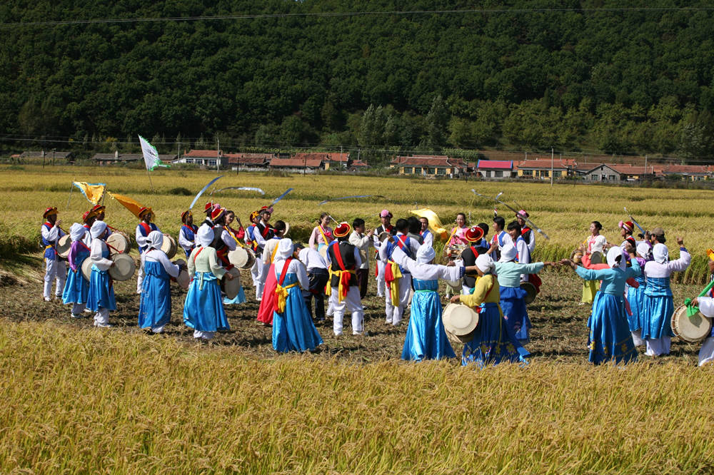 Gathering in fields or villages during community festivals, members of the Korean ethnic group in Jilin and other provinces in northeastern China offer a traditional sacrifice to the God of the Land to pay homage to nature and pray for good fortune and a plentiful harvest. This is the beginning of the farmers’ dance of China’s Korean ethnic group, a popular folk practice passed on by senior members of a community to younger generations. Musicians play oboe-like suona, bell-shaped gongs and a variety of drums, while masked or unmasked dancers move farcically to the accompaniment. The dance is inspired by the motions of farming, which it imitates through gestures such as ‘walking the field ridges’. Spreading from its agricultural origins to Korean people of all walks of life in both urban and rural areas, the dance has evolved considerably since it was brought to China at the end of the nineteenth century. For example, the musical ensemble has been expanded to include wind instruments and the dancers’ costumes have been influenced by the clothes of other Chinese ethnic groups. As the product of accumulated labour and wisdom, the farmers’ dance remains an important expression of the cultural heritage of China’s Korean ethnic group.