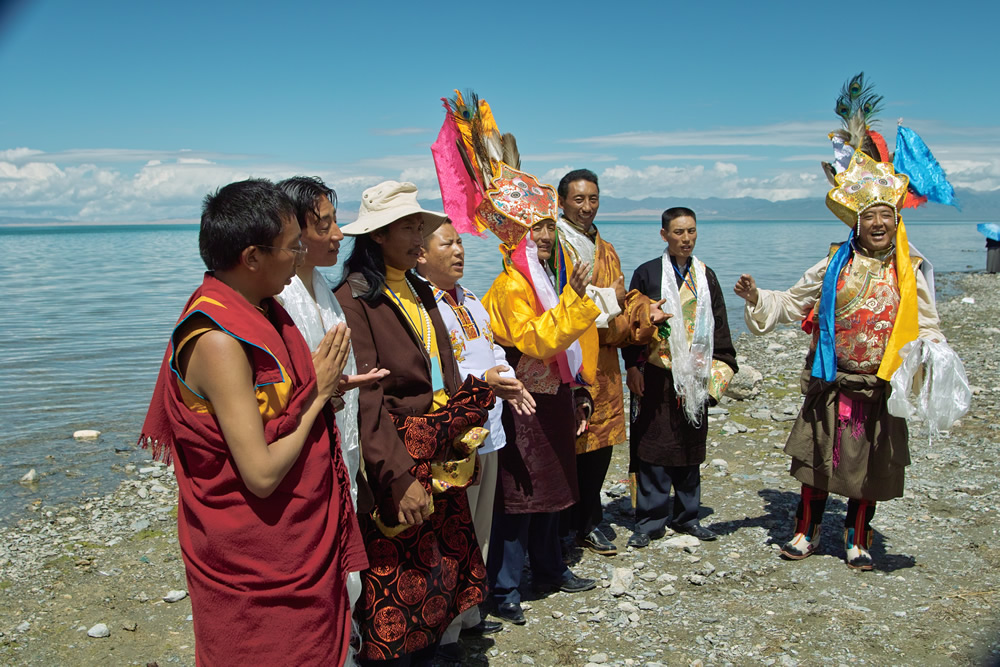 A group of young Gesar epic singers meet on the shore of the Qinohai Lake [Photo/IEL of CASS]