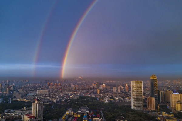 A spectacular double rainbow appears over Changchun, capital of Northeast China's Jilin province, on June 11, following continuous rains. [Photo by Xu Chang/Xinhua]