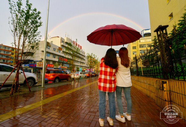 Two Changchun locals take in the wonders of the double rainbow on June 11. [Photo by Luo Hao/cnjiwang.com]