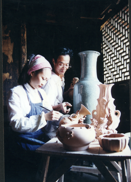 The city of Longquan in the coastal Chinese province of Zhejian is known for its celadon pottery and the traditional firing technology that imparts its distinctive glaze. Compounded from violet-golden clay and a mixture of burnt feldspar, limestone, quartz and plant ash, the glaze is prepared from recipes that have often been handed down for generations by teachers or within families. The glaze is applied to a fired stoneware vessel, which is then fired again in a repeated cycle of six stages of heating and cooling where precise temperatures matter a great deal: either over- or under-firing will spoil the effect. Experienced celadon artists carefully control each stage with a thermometer and by observing the colour of the flame, which reaches temperatures as high as 1310º C. The final product may take either of two styles: "elder brother" celadon has a bluish-grey finish with a crackle effect, while the "younger brother" variety has a thick, lavender-grey and plum-green finish. With its underlying jade-like green colour, celadon fired by the family-oriented businesses of Longquan is prized as masterwork-quality art that can also serve as household ware. It is a proud symbol of the cultural heritage of the craftspeople, their city and the nation.