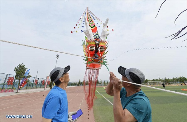 Participants fly a kite during a kite flying contest held in Baotou, North China's Inner Mongolia autonomous region, June 15, 2019. [Photo by Wang Zheng/Xinhua]