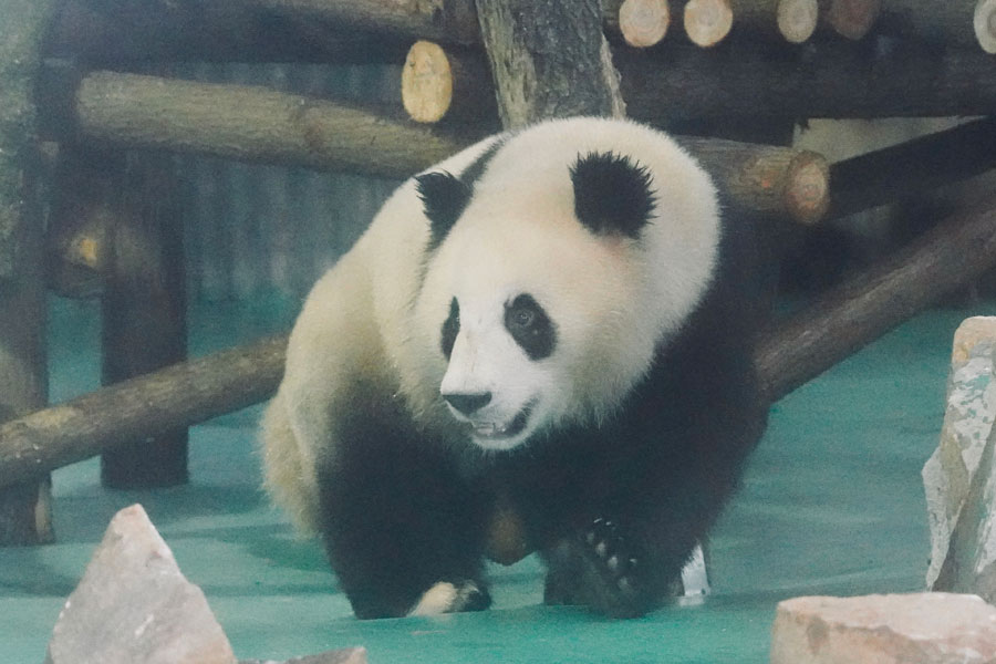 Three-year-old male giant panda He Feng from Chengdu, Sichuan province, is seen in the pavilion at Shanghai Zoo. [Photo provided to chinadaily.com.cn]