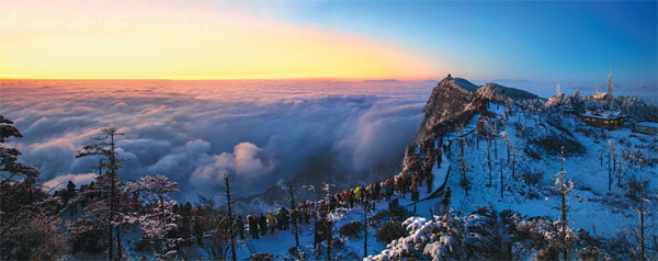 Wanfoding, the highest peak on Mount Emei in Leshan, Sichuan province, is covered with white snow in winter. Located on the western rim of the Sichuan Basin, Mount Emei stands at 3,099 meters above sea level and is home to over 3,200 types of plants and 2,300 types of animals. It is one of the four scared Buddhist mountains in China and was named a UNESCO World Natural Heritage Site in 1996. [Photo by Gao Luchuan for www.chinaservicesinfo.com]