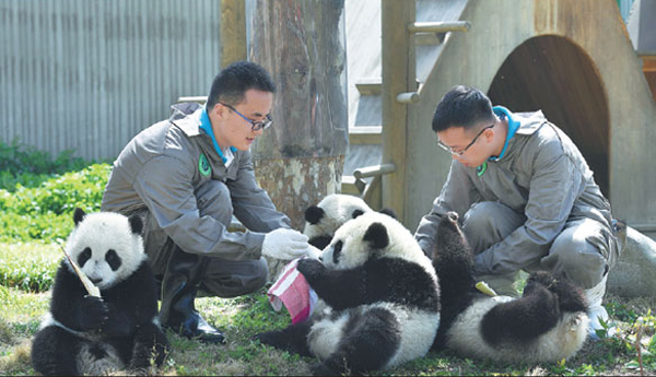 Breeders feed giant pandas breakfast at the China Conservation and Research Center for the Giant Panda in Sichuan province. [Photo by He Haiyang for www.chinaservicesinfo.com]
