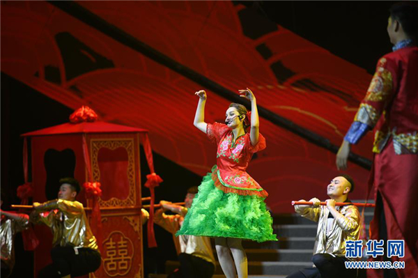 A performance integrating Chinese and Russian culture elements is staged in the Global Theater of Harbin, Northeast China’s Heilongjiang province on June 14. The event, including performances of dances, Chinese opera, Russian folk songs and acrobatics, is part of the sixth China-Russia Expo, a platform for Sino-Russian economic and trade cooperation. [Photo/Xinhua]