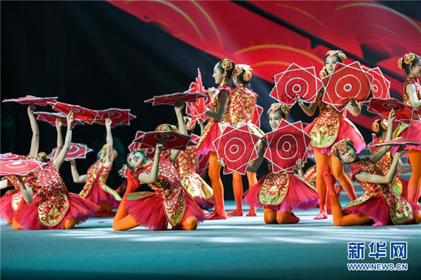 A performance integrating the element of erenzhuan (a popular musical and dramatic folk art of Northeast China) is staged in the Global Theater of Harbin, Northeast China’s Heilongjiang province on June 14. The event, including performances of dances, Chinese opera, Russian folk songs and acrobatics, is part of the sixth China-Russia Expo, a platform for Sino-Russian economic and trade cooperation. [Photo/Xinhua]