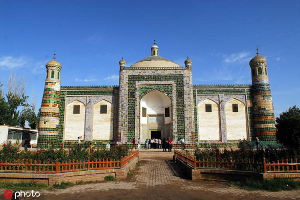 Five kilometers northeast of Kashgar, an ancient Islamic building nestles among poplar trees. With glazed tiles shining in the sun, its tower points to the azure sky. Tomb of Xiangfei is a master piece of Uigur architecture. Xiangfei, the only Uigur concubine among the 41 wives of Emperor Qianlong in the Qing Dynasty (1644 - 1911). She spent 28 years beside the emperor in Beijing, abiding strictly by Islamic doctrines. She wore ethnic costumes and was waited on by a special chef. It is admired as a well-presented Islamic architecture complex not only in Xinjiang, but throughout China.[Photo/IC]