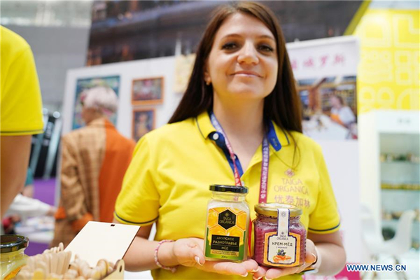 A staff member displays Russian honey products during the 6th China-Russia Expo in Harbin, capital of northeast China's Heilongjiang Province, June 17, 2019. The expo, as an important platform for bilateral economic and trade cooperation, attracted more than 1,300 enterprises from China's 21 provincial-level regions and Russia's 18 oblasts. [Photo/Xinhua]
