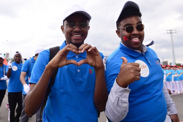 Two foreign participants pose for a photo at the opening ceremony for the hiking festival in Shenyang, Liaoning province, on June 15.