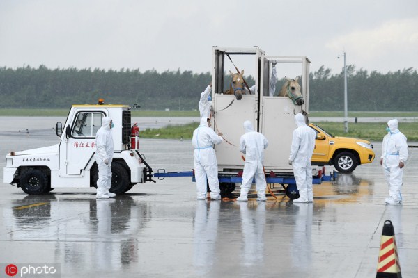 Workers transport the horses at Changchun Longjia International Airport, on June 14. [Photo/IC]