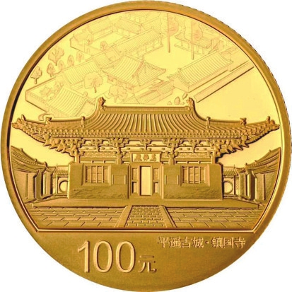 The 8 g gold commemorative coin is inscribed with as representation of Pingyao's Zhenguo Temple on the reverse. [Photo/Shanxi Daily]