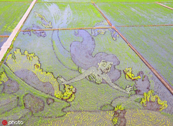 A paddy field painting in the shape of mermaid goes on display in Shenyang. [Photo/IC]