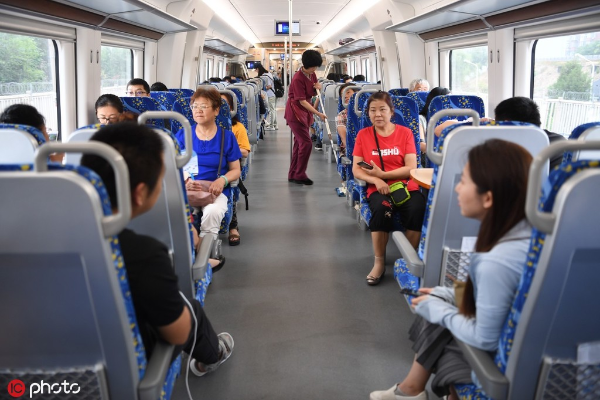 Passengers take their seats on the first train to depart from Qiaozhuang East Station in Tongzhou sub-center to Beijing West Railway Station in western Beijing, June 20, 2019. [Photo/IC]
