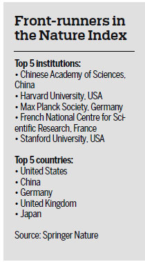 The Chinese Academy of Sciences remains the world's top academic institution, and China held onto the second spot for the quality of research output in the latest Nature Index tables, which have been published annually since 2014.