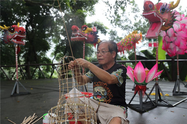 Li Zhiqiang, the founder of the segmented "Lotus Dragon", presents the production process.[Photo by Wang Jing/China Daily]