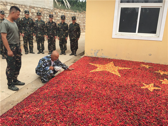 Students from Dalian Institute of Science and Technology used thousands of kilograms of cherries to make a national flag – with red cherries as the background red and yellow cherries for the flag's stars -- for the old man. They also invited a man who formerly served in the Tian'anmen National Flag Guard to visit and have a talk with the senior citizen.