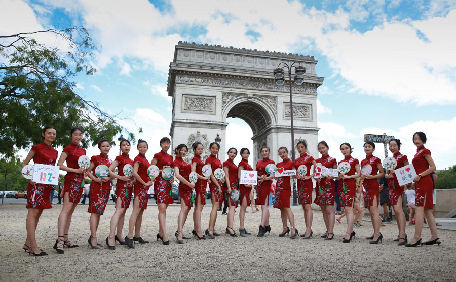 Chinese models wearing qipao designed by the famous Chinese designer Li Jialin pose at the 2019 Hangzhou Global Qipao Festival at the Arc de Triomphe in Paris, France on June 19. [Photo provided to chinadaily.com.cn]