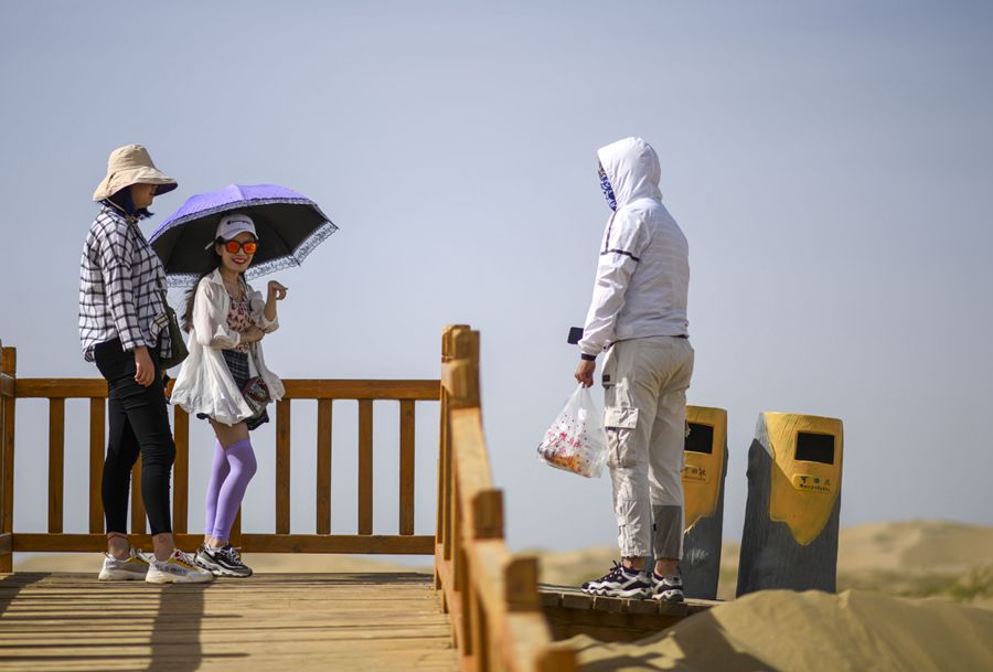Tourists visit Lop Nur People village of Yuli county, Northwest China's Xinjiang Uygur autonomous region, June 19, 2019. Known for its natural scenery and ethnic culture, Lop Nur People village keeps attracting numerous tourists. From May 1 to June 23, 2019, Lop Nur People village has received more than 52,000 visitors, with a year-on-year increase of 78 percent. [Photo/Xinhua]