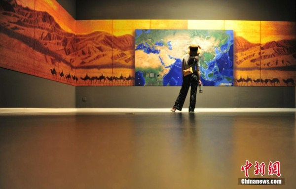 A visitor views Silk Road-themed paintings during the Shenyang exhibition, on June 21. [Photo by Yu Haiyang/Chinanews.com]