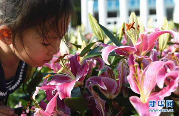 A girl savors the fragrance of lilies in full bloom at Shenyang Expo Park in Shenyang, in Northeast China’s Liaoning province. Multicolored flowers have recently begun to bloom at the park, attracting many admirers. [Photo by Jiang Bing/Xinhua]