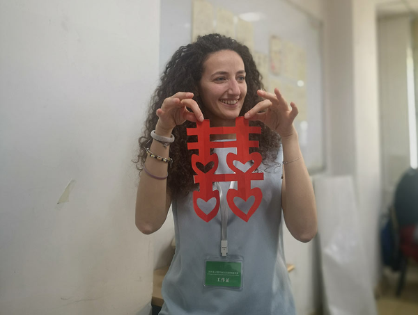 A students tries papercutting at a summer camp organized by Beijing Foreign Studies University and the Confucius Institute at the University of Rome. [Photo provided to China Daily]