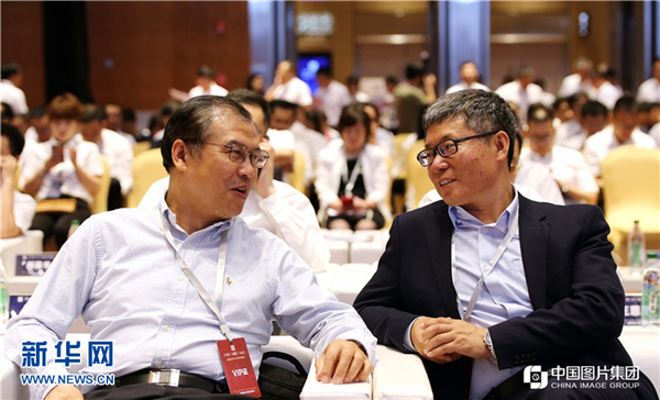 Jiang Keliang (R), chairman of the Northeast China branch of Tingyi (Cayman Islands) Holding Corporation, attends the High-Quality Enterprise Development Techniques Forum in Shenyang, capital of Northeast China’s Liaoning province, on June 17. [Photo/Xinhua]