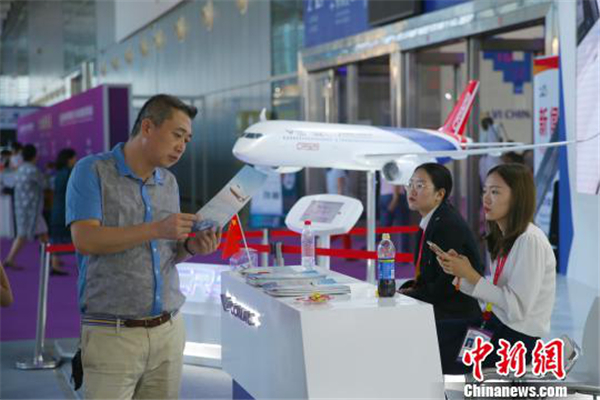 A visitor reads about the CR929 long-range wide-body aircraft manufactured by China-Russia Commercial Aircraft International Co Ltd, at the sixth China Russia Expo. [Photo/chinanews.com]