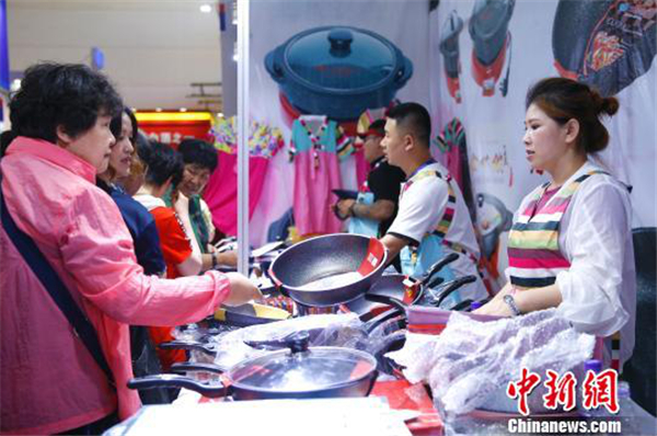 A Korean kitchenware exhibition stand proves to be a popular hit at the sixth China Russia Expo. [Photo/chinanews.com]