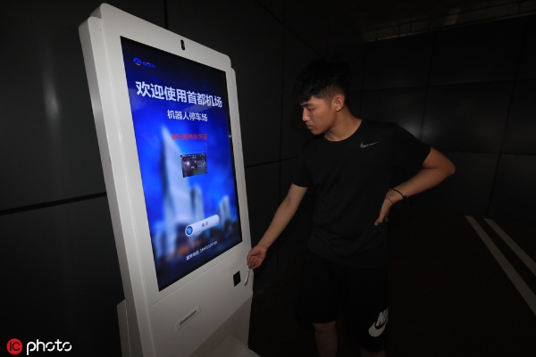 The driver scans the QR code on the ticket to retrieve his car. [Photo/Beijing News, IC]