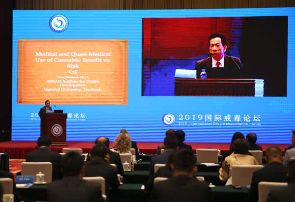 Viroj Sumyai, former president of the International Narcotics Control Board, gives a speech on Wednesday at the forum on addiction treatment held in Kunming, southeast China's Yunnan province. [Photo by Chen Zebing/China Daily]