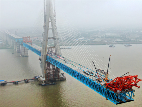 Photo taken on June 27, 2019 shows the construction site of a Yangtze River bridge on the Shanghai-Nantong railway line in Nantong, East China's Jiangsu province. [Photo/ by Xu Congjun/For China Daily]