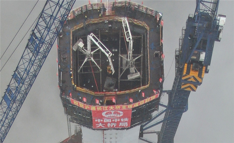 Main tower of world's largest road-rail cable-stayed bridge built