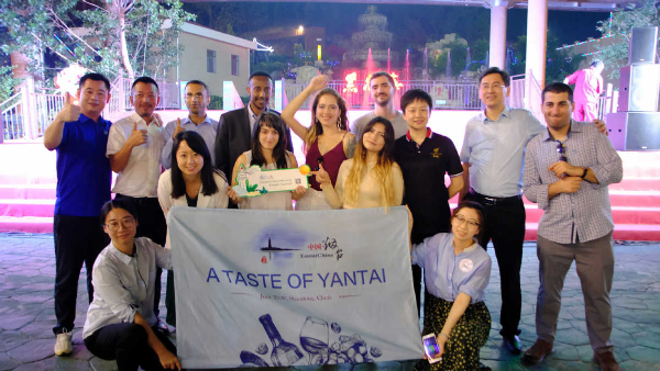 Organizers and fans of Yantai’s social media accounts take a group picture at Heishangmei, a raspberry wine producer in Yantai, Shandong province, on June 29. [Photo by Xiao Da/chinadaily.com.cn]
