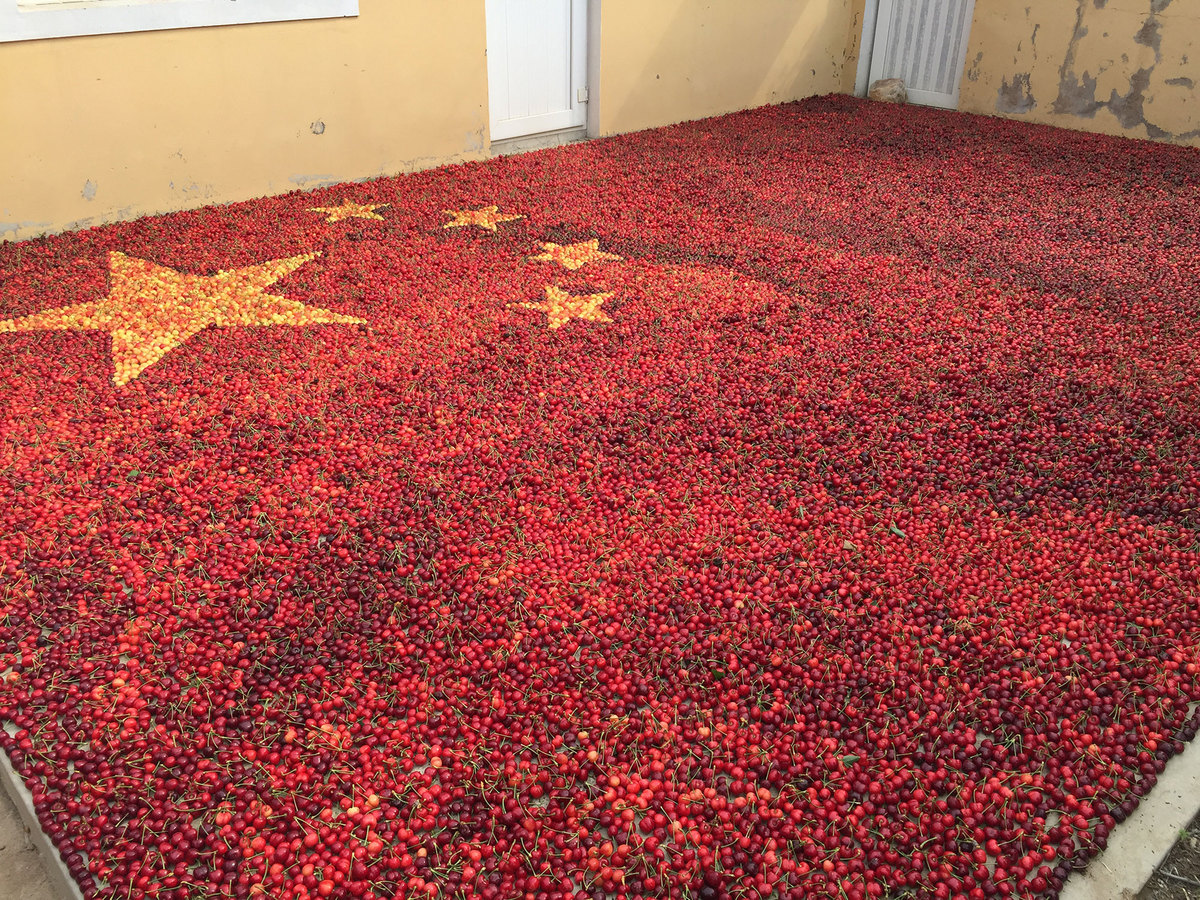 Dalian University of Science and Technology students made a seven-meter-long and 4.7-meter-wide "five-starred red flag" with nearly 500 kilograms of cherries in Dalian, Liaoning province.